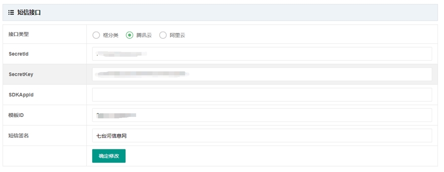 一、將騰訊云的secretid和secretkey 填寫到網(wǎng)站后臺(tái)【短信接口】中