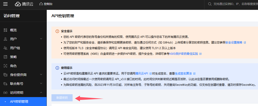 騰訊云secretid和secretkey在【訪問管理】【訪問密鑰】【API密鑰管理】中,點新建密鑰獲取。