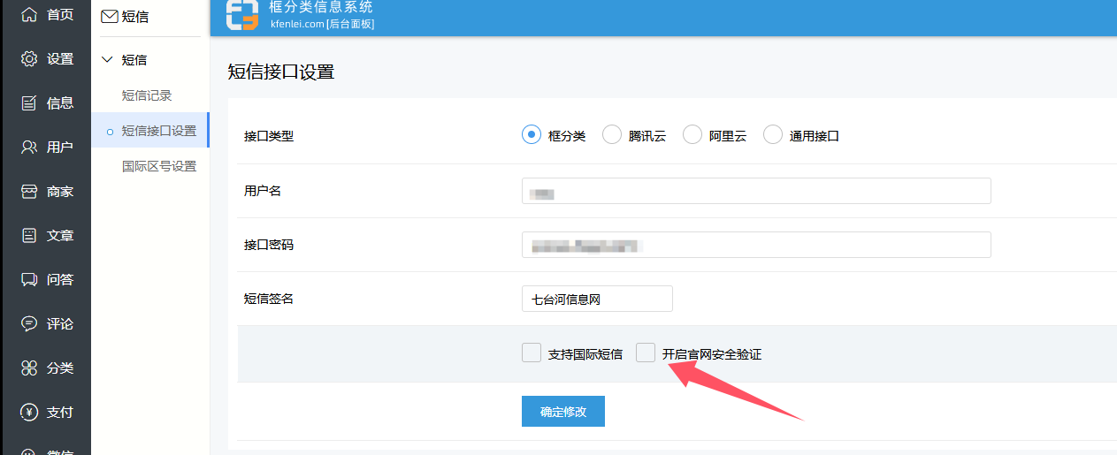 使用官網(wǎng)短信接口的,無需額外配置,在短信接口設置中,鉤選【開啟官網(wǎng)安全驗證】即可。