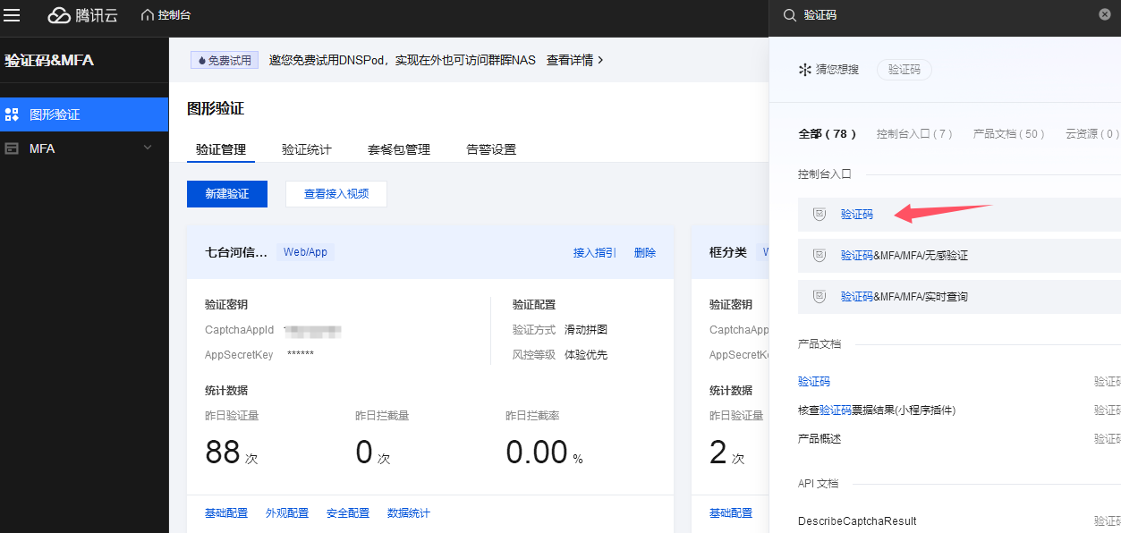 在騰訊云控制臺中搜索驗證碼開通,費用是300元3萬次,只有驗證通過的用戶才算次數(shù)??梢悦赓M試用7天。