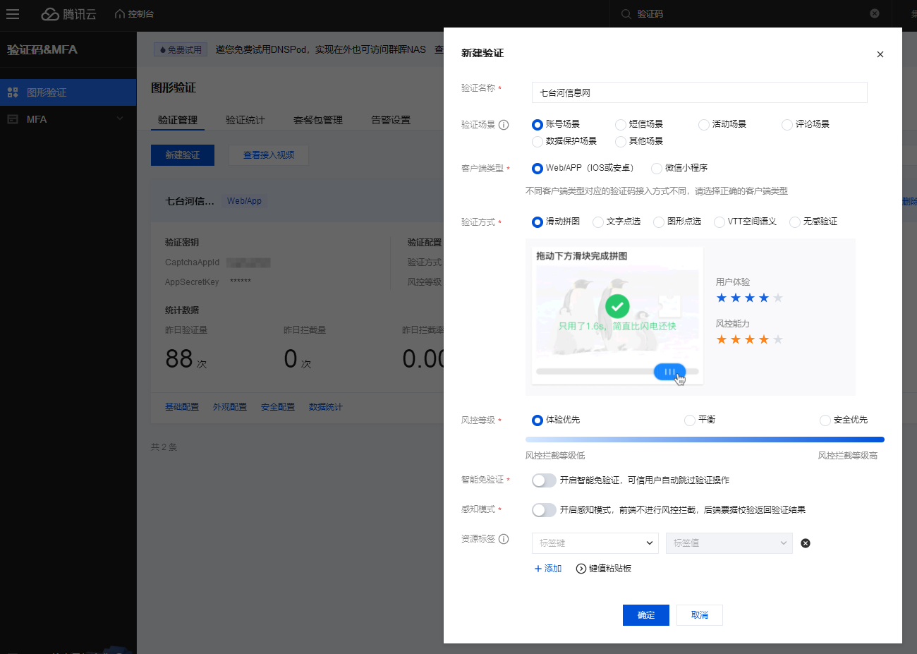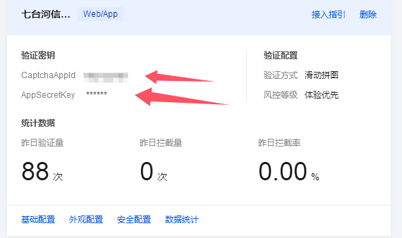 創(chuàng)建成功后,復制CaptchaAppId和AppSeecretKey到網(wǎng)站后臺