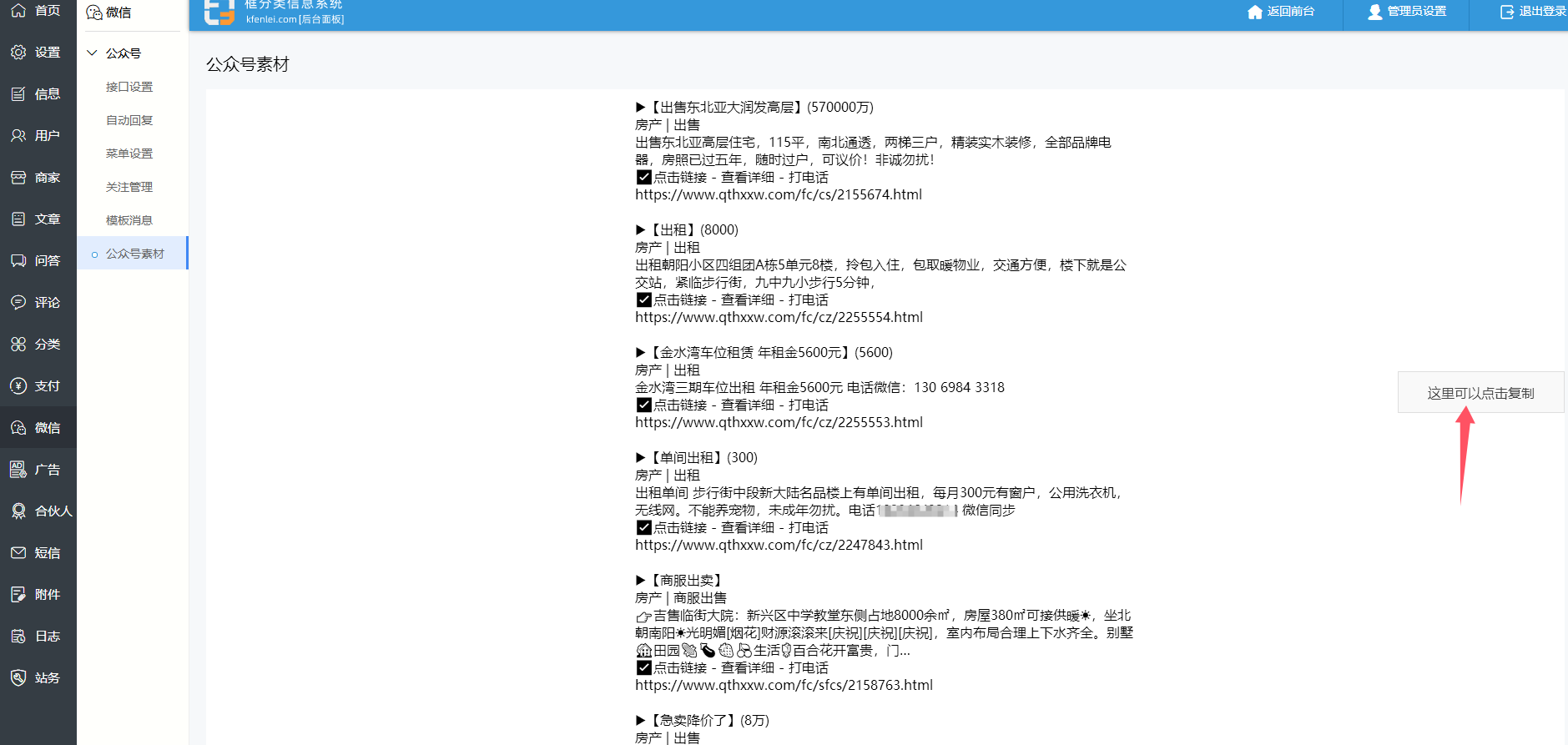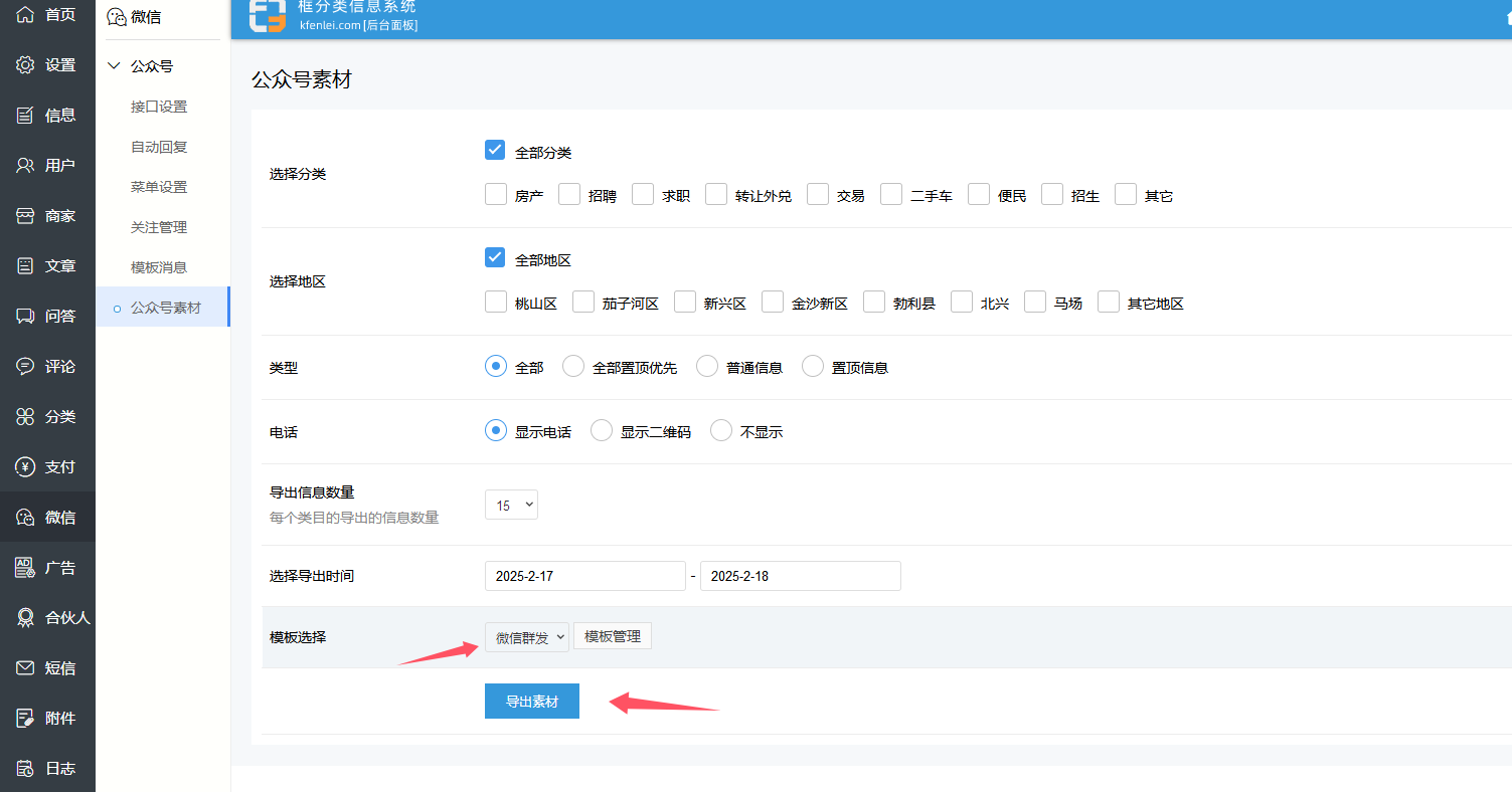 添加完成后,在公眾號(hào)素材中,根據(jù)需要選擇要導(dǎo)出信息的分類、地區(qū),時(shí)間范圍。模板選擇【微信群發(fā)】。點(diǎn)擊導(dǎo)出素材。就可以導(dǎo)出微信群發(fā)文本了