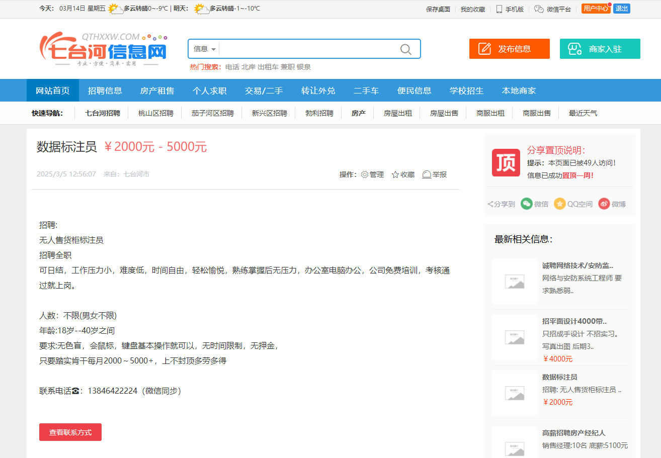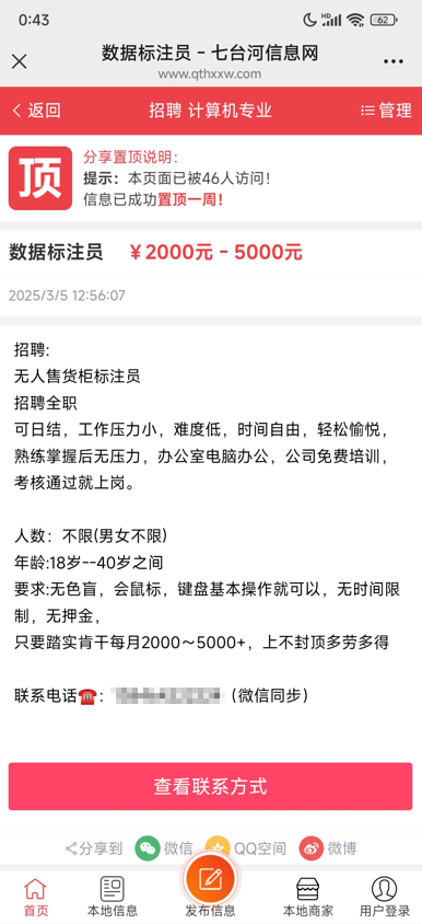 對于已經有知名度和訪問量的網站來說,每天的信息數(shù)還有付費置頂?shù)娜艘呀浐芏嗔?,怎么設置這個數(shù)量哪。首先你要知道你的7天置頂?shù)膬r值是多少錢。比如你的7天置頂?shù)膬r格是50元,你們當?shù)氐男麄鞒杀究赡苁?元錢一個人(什么是宣傳成本哪,就是如果你用其它宣傳方式,用100元可以宣傳到多少人),你就可以設置成50個,就是有50個人點擊后,他的信息置頂一周。當然,你設置的數(shù)越大,分享的人可能越少,比如設置500,但是依然會有用戶去分享的,因為分享的頁面顯示的是他自己發(fā)布的內容。