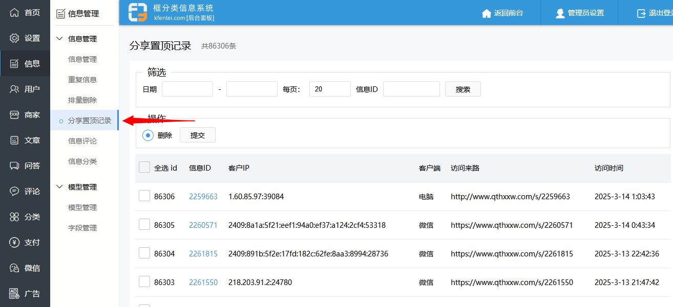 登錄網站后臺 – 信息管理 – 分享置頂記錄,可以看到有多少個IP通過分享置頂頁面訪問??梢钥吹焦倬W演示站每天分享置頂鏈接會帶來幾千個IP,網站得到了多么大的推廣。