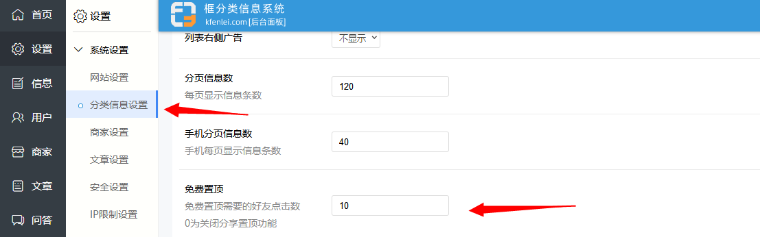 首先登錄框分類的【后臺】【設置 】【分類信息設置】中找到“免費置頂 免費置頂需要的好友點擊數(shù)”,修改這個數(shù)字即可。