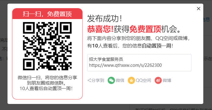用戶可以直接分享到微信朋友圈、微信群、也可以分享到QQ空間、微博等。當有10個人點擊后,用戶的這條信息就會自動置頂一周了(當然:需要多少人點擊,后臺是可以設置的,后面會提到。)