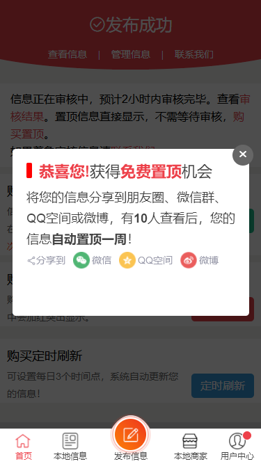 用戶在我們的網站發(fā)布完信息后會得到一個提示,“信息發(fā)布成功,恭喜您!獲得免費置頂?shù)臋C會”。如下圖: