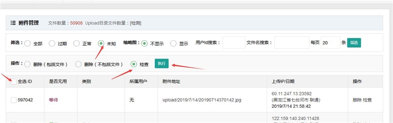回到附件管理中,篩選未知,全選,檢測(cè),執(zhí)行。就可以檢測(cè)出圖片是否有用了,檢測(cè)后的圖片狀態(tài)就會(huì)變成正?;蜻^(guò)期,然后就可以把顯示過(guò)期的圖片刪除了