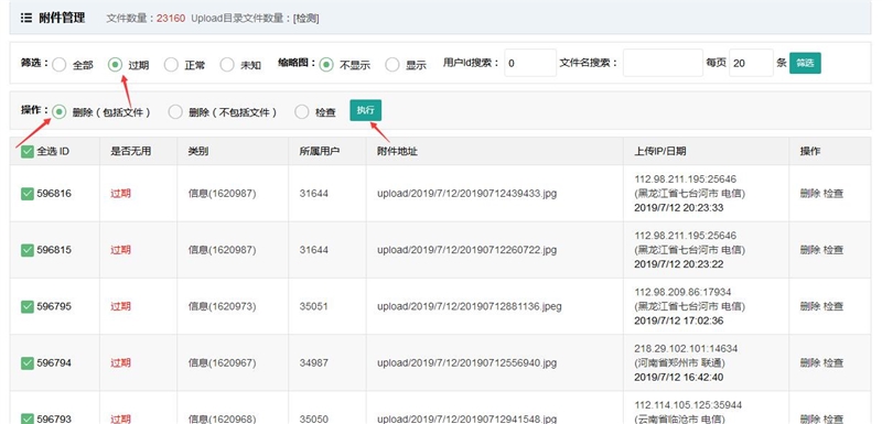 如何刪除過(guò)期附件方法一、通過(guò)上部的篩選,選擇過(guò)期圖片,全選,選擇刪除(包括文件)點(diǎn)執(zhí)行就可以了