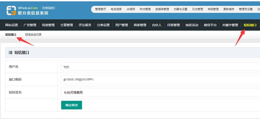把短信驗證接口中的用戶名和接口密碼填到您自己的網(wǎng)站后臺的短信接口中
