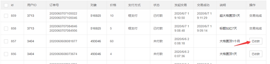 已付款:這個就是用戶已經付款,后由于密鑰填的不對,或網絡的原因,沒有成功通知到你的網站,需要站長到自己網站后臺,找到這個定單,手動點一下已收款按鈕。