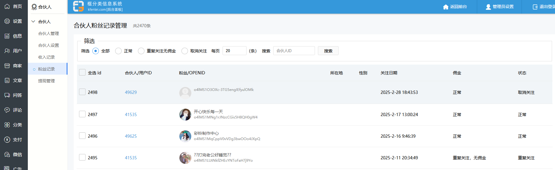 設(shè)置合伙人海報二維碼為公眾號,可以在粉絲記錄中,查看粉絲關(guān)注情況。也可以在后臺【微信】 - 【關(guān)注管理】中,查看公眾號關(guān)注情況,可以看到關(guān)注多少人,取消關(guān)注多少人。