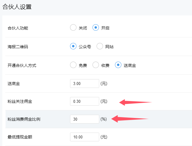 3、送底金,用戶免費開通成合伙人,并在賬號中送一定金額的底金。底金可提現(xiàn),可以設(shè)置最低提現(xiàn)金額,如:送3元,滿10元可提現(xiàn)。
