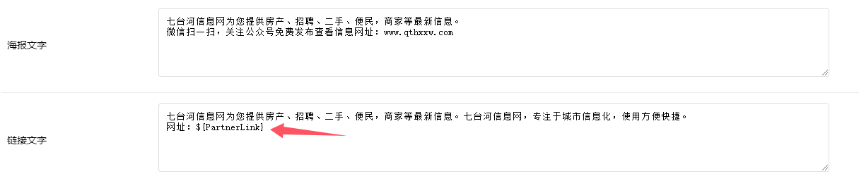 設(shè)置鏈接文字時,鏈接用${PartnerLink}標簽替代,用戶生成合伙人鏈接時,會自動替換成 http://域名/s/p_合伙人ID 這樣的鏈接。