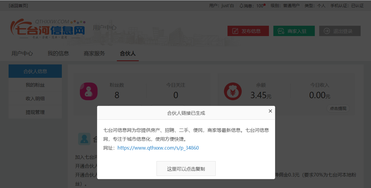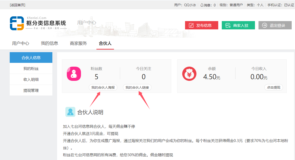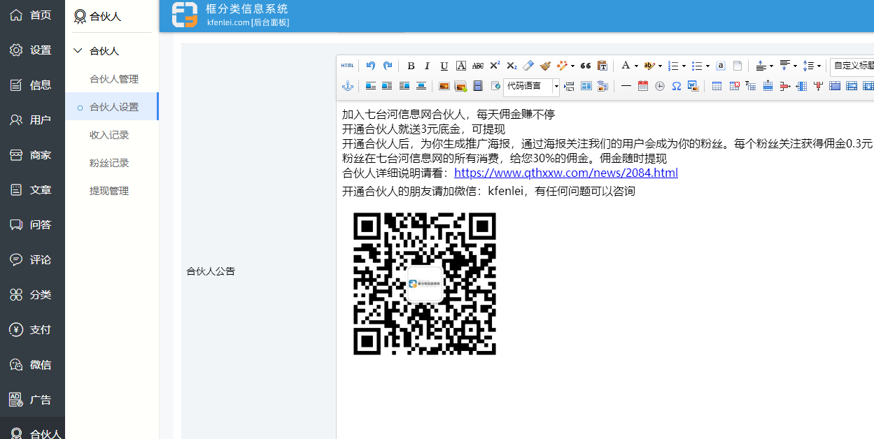 在用戶開通合伙人時可以看到,站長可以自己設(shè)置,也可以在文章中,添加一個文章,詳細說明合伙人功能,加到公告后面,有用到的站長可以直接復(fù)制我們七臺河信息網(wǎng)的合伙人說明:https://www.qthxxw.com/news/2084.html