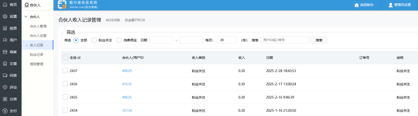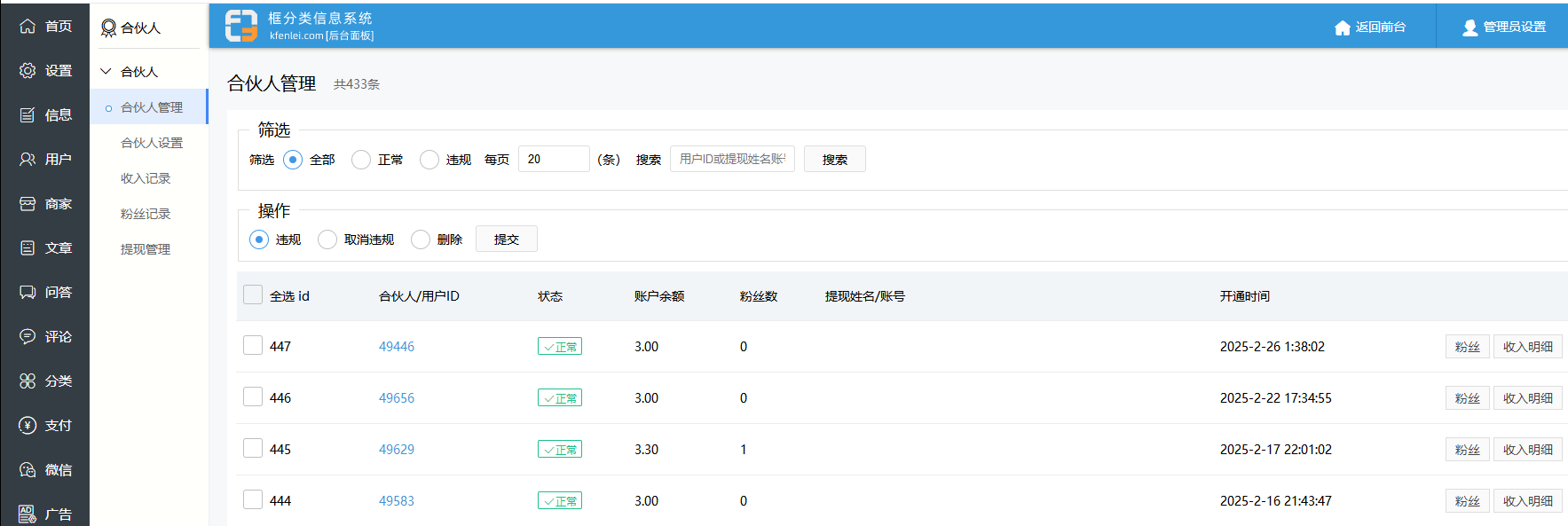 在后臺合伙人管理中,可以管理所有合伙人,可以查看每個合伙人的收入明細、賬戶余額、粉絲數(shù)量等。如果有合伙人違規(guī)操作,惡意刷粉絲和傭金等,可以把此合伙人設(shè)為違規(guī),這樣此合伙人就不能進行任何操作了。