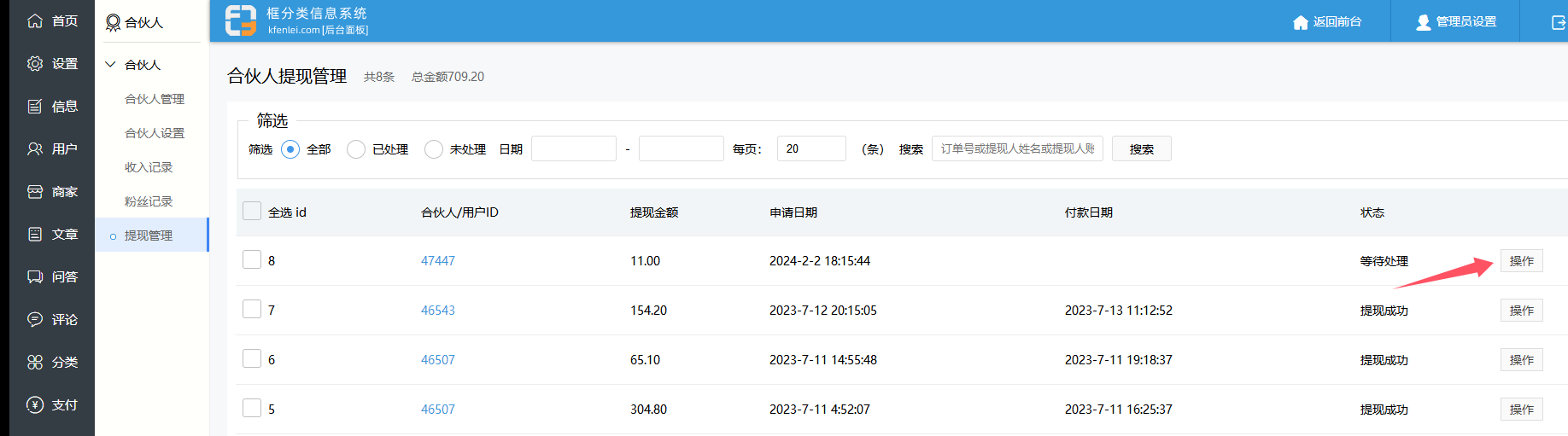 合伙人在前臺申請?zhí)岈F(xiàn)后,需要站長在后臺手動處理。在后臺 - 合伙人 - 提現(xiàn)管理,可以查看合伙人的提現(xiàn)申請。點擊【操作】可以看到合伙人的提現(xiàn)資料。站長向合伙人手動付款后,狀態(tài)設(shè)置為已支付,選擇支付日期,填寫轉(zhuǎn)帳訂單號,同時可以上傳轉(zhuǎn)賬截圖憑證,已備記錄,這樣提現(xiàn)就完成了。