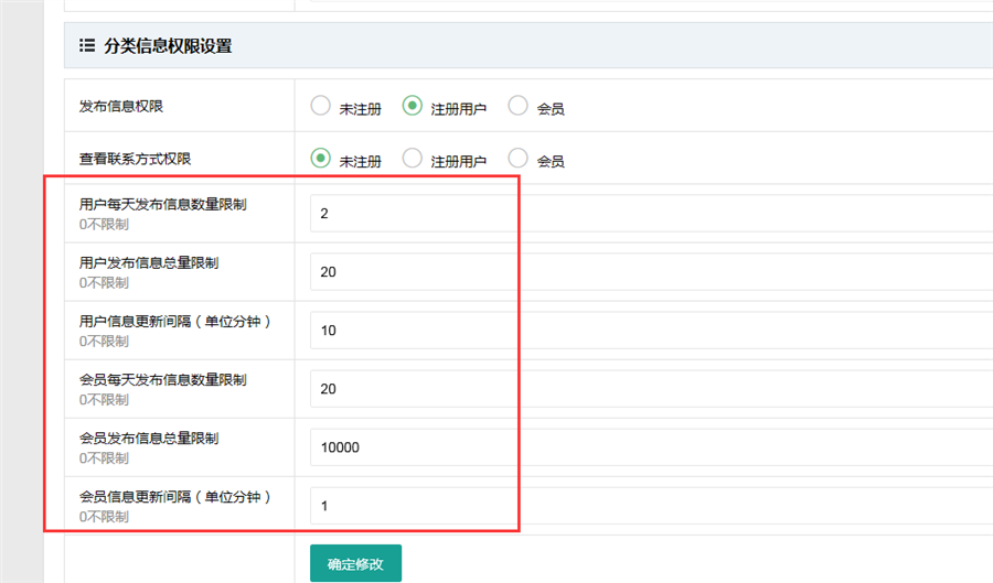 中介和商家用戶(hù),在服務(wù)期內(nèi),后臺(tái)應(yīng)該是可以設(shè)定可以免費(fèi)發(fā)布多少條信息的。但是目前沒(méi)有這個(gè)功能,造成包年的中介和商家發(fā)布信息也是收費(fèi)的!希望在后臺(tái)增加中介和商家用戶(hù)選項(xiàng),一個(gè)月內(nèi)可以免費(fèi)發(fā)布多少條信息數(shù)量設(shè)置功能,就象下圖所示的。