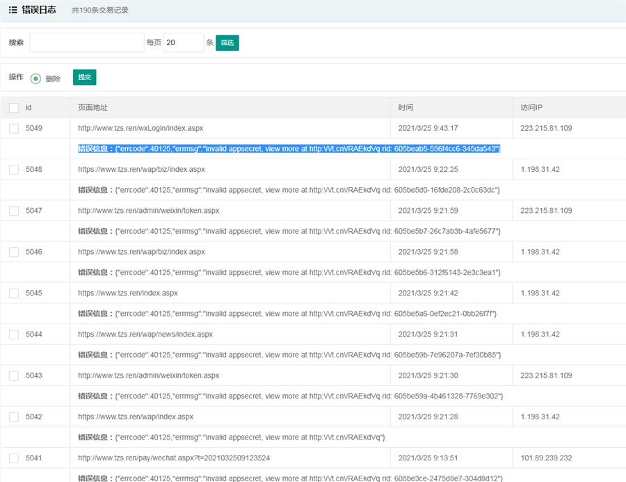 錯(cuò)誤信息:{"errcode":40125,"errmsg":"invalid appsecret, view more at http:\/\/t.cn\/RAEkdVq rid: 605beab5-556f4cc6-345da543"}