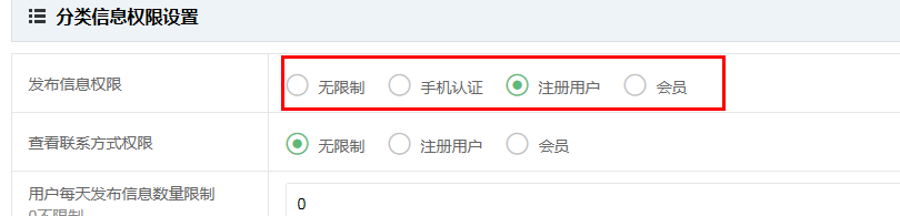 在后臺(tái) - 安全設(shè)置中,可以設(shè)置注冊(cè)用戶需要手機(jī)認(rèn)證的,這樣手機(jī)認(rèn)證的用戶就不需要每次發(fā)布信息都認(rèn)證一次了