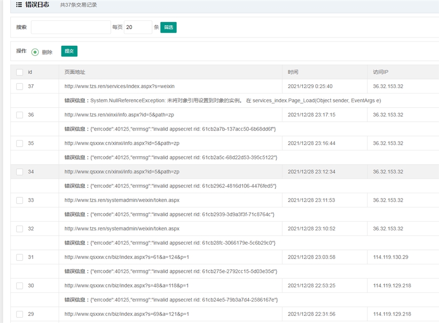 這個先確定是否是已認證的服務號,在后臺日志【錯誤日志】中,可以看到對應的錯誤日志