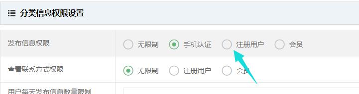在后臺(tái)【網(wǎng)站設(shè)置】【分類信息設(shè)置】中,把發(fā)布信息權(quán)限設(shè)置成注冊(cè)用戶,這樣只有登錄賬號(hào)后才可以發(fā)布信息