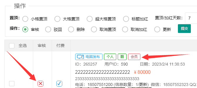 1:會(huì)員發(fā)布如何設(shè)置不用審核直接顯示啊,后臺我都設(shè)置了,不用審核,可會(huì)員發(fā)布的時(shí)候,還得登錄后臺去審核,太麻煩了