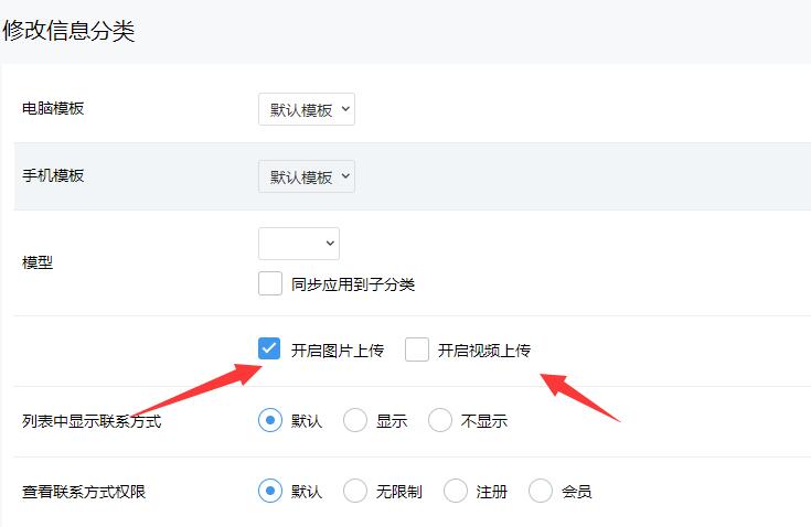 在后臺->分類設(shè)置中,修改分類,可以設(shè)置圖片上傳和視頻上傳