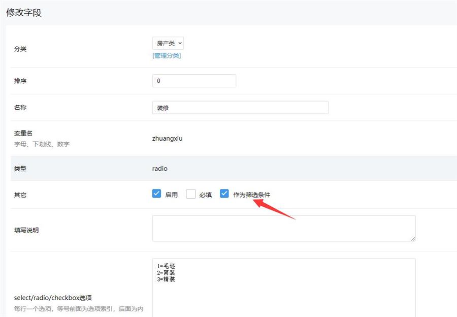 如:后臺(tái)增加模型變量名fcleixing,類型是radio