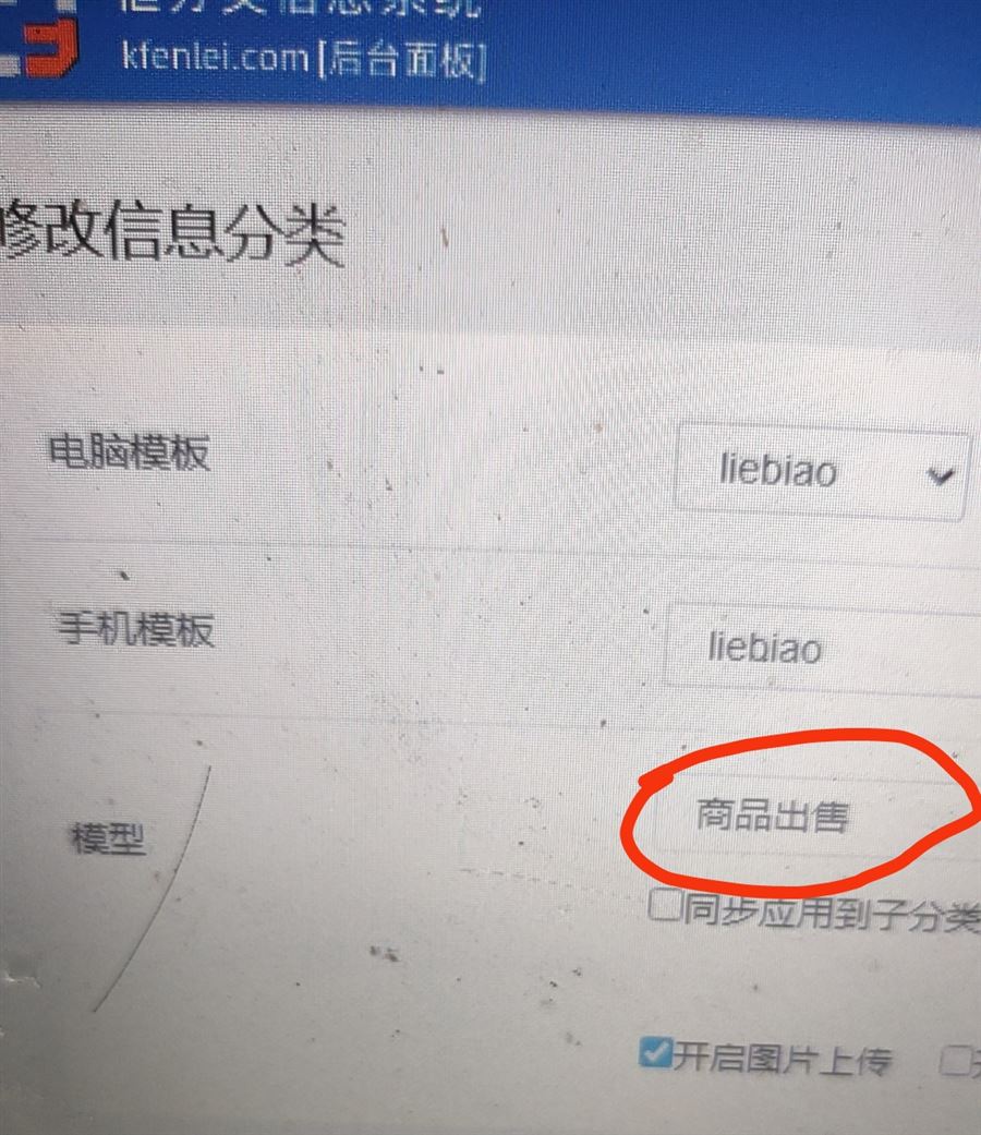 2:管理后臺,修改分類,模型選擇:商品出售,電腦與手機(jī)模板都是以前的liebiao,因?yàn)槿绻沂掷锬0甯某蓋apshangpinchushou的話,內(nèi)容詳情頁就打不開,只顯示目錄地址,看圖
